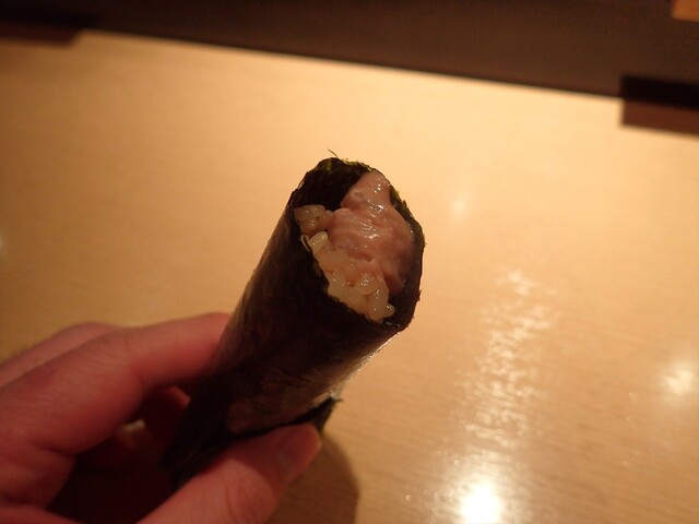 この日は、宮崎産のもの。1670kgの特大サイズのもので、筋が多いので、丁寧に取り除いたとのこと。トロリととろける口当たりに加え、旨味もたっぷりで、ネタ、シャリ、醤油のハーモニー再び。もう笑みが止まりません。