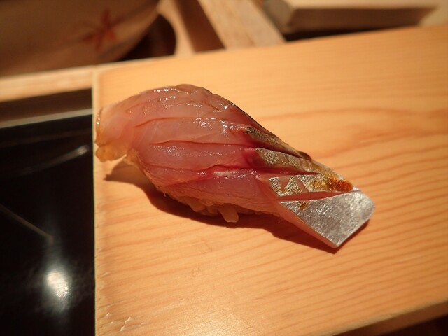 他の寿司もそうですが、赤酢のシャリがほどよいまろやかな酸味でお米のおいしさを感じられます。その赤酢シャリ、アジの旨味、ネタへの塗り醤油のハーモニーで口福な一貫。