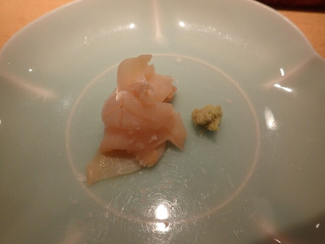 塩がパラパラとかかっています。追いワサビでいただいてくださいとのこと。切り方も一般的な刺身とは違う感じ。柔らかく、バイ貝の風味を楽しめました。