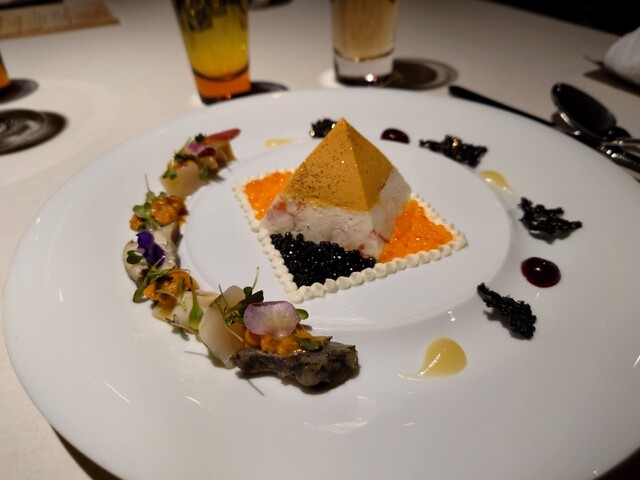 前菜からオシャレだし、雲丹と蟹のピラミッドの回りを敷き詰めるキャビアとイクラ…お肉も柔らかくて美味しく、トリュフにフォアグラ、こんなふんだんに使われてていただくのは初めて