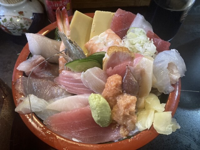 このお店に来たら最も頼むことが多い海鮮丼を今日も選択。ネタダブルダブルで、シャリを特もりにします。基本的にメイン料理は大将が作っていますので、注文が混んでいる時はかなりの待ち時間となり、気長に待ちます。ちなみに時間がかかる時は言ってくれますので、安心。