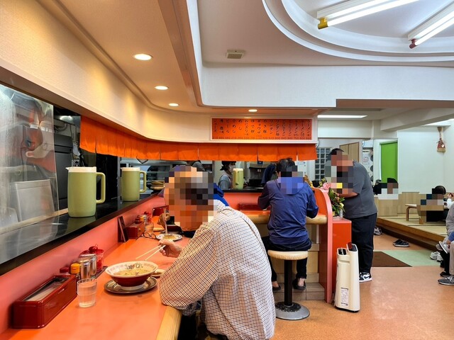 時は昼過ぎ。にもかかわらず、店舗の脇や後ろにはかなりの台数の駐車スペースがあるのですが、ほぼ満車状態です。店内もテーブル席は待ちが発生している状況。この日はひとりで行ったため、幸いにして待つことなくカウンターに通されました。