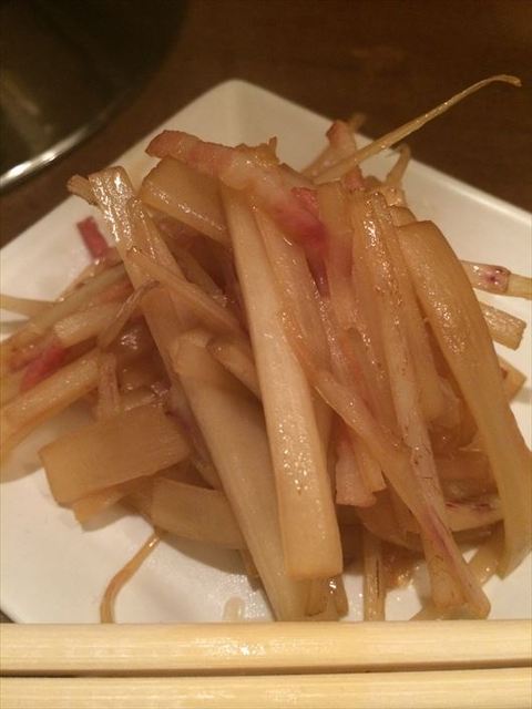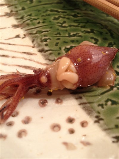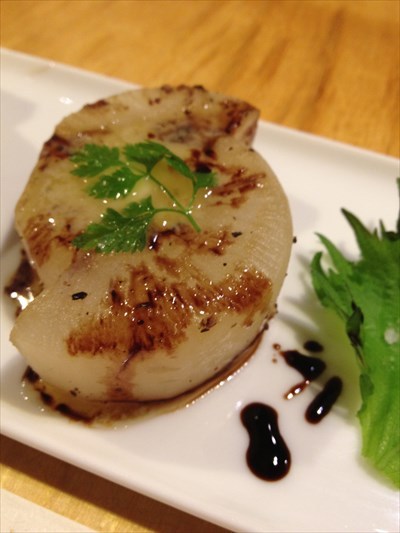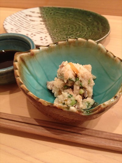 つるっとした豆腐ではなくて、お芋のしっとり感、ホタルイカの旨みを、酸味のあるポン酢ジュレで引き締めます。先日の「酒蔵 縁」さんでも、ホタルイカにキウイソースをかけたものがあったので、ホタルイカには酸味のあるソースがあうのかもしれません。