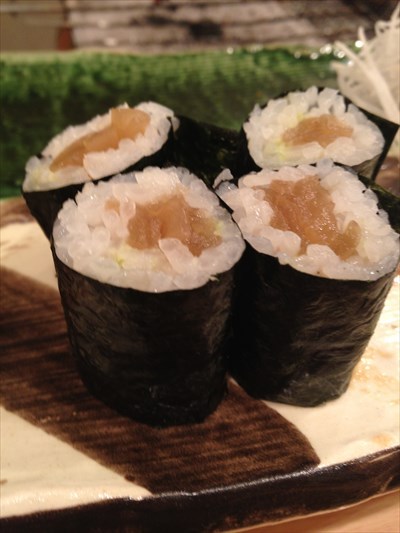 奥に見えている赤身はまぐろではなくて、かつお。皮は軽くあぶっています。