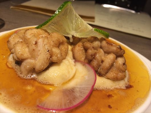 つるっとした豆腐ではなくて、お芋のしっとり感、ホタルイカの旨みを、酸味のあるポン酢ジュレで引き締めます。先日の「酒蔵 縁」さんでも、ホタルイカにキウイソースをかけたものがあったので、ホタルイカには酸味のあるソースがあうのかもしれません。