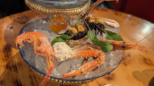 いくらと蟹身が乗った牡蠣は、先ほどの兵庫室津のもの、こちらは牡蠣しょうゆで。ウニやエビ、カニはスイートチリソースでと、目でも舌でも楽しいプラッターでした(Owl)