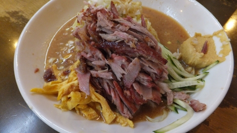 冷麺の上には、名物の焼豚がたっぷり乗っています。