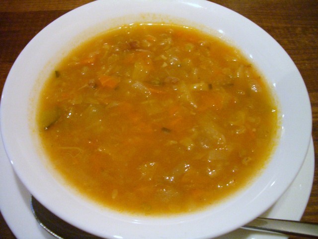 まずは、野菜スープです。野菜の味わいが口いっぱいに広がり、少し塩気のある粉チーズを振りかけていただくと、