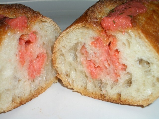 見た目は、パンの上に明太子が塗られている感じがしますが、ナイフでカットしてビックリですo(^◇^)oオオー!!