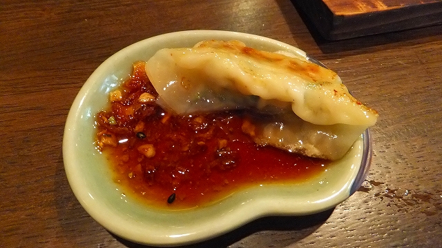 ギョウザは、食べるラー油が入ったタレで頂きます。