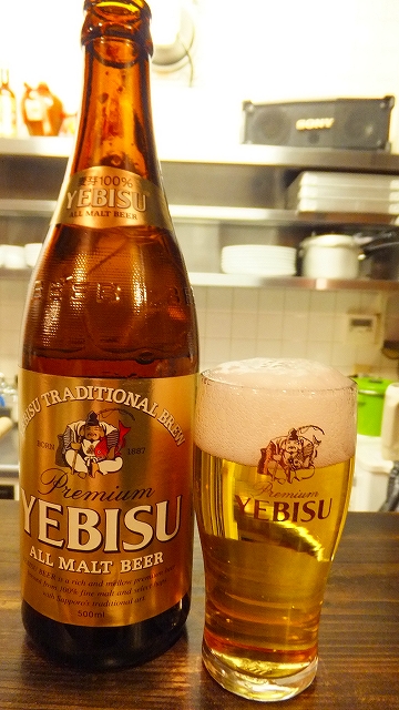 エビスのビンビールで乾杯です。