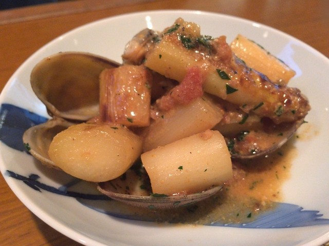ぶっといホワイトアスパラと、あさり、ホヤのソテーですが、