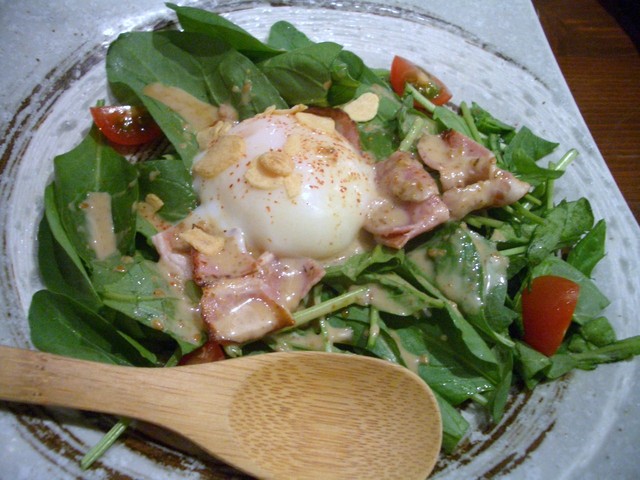 温泉卵のトロトロ感と、ほうれんそう&ベーコンのコラボが美味しいです。