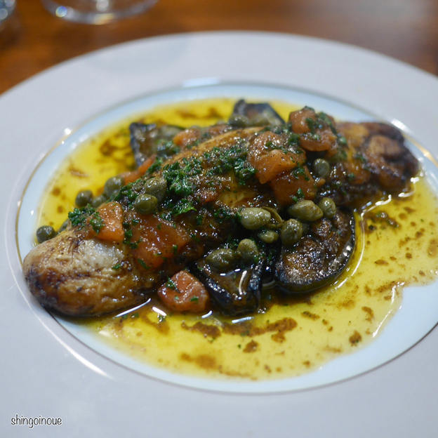 プチメイン的な立ち位置の「白子のムニエル」。なぜかいつも頼んでしまう。下ごしらえをした白子が目の前のキッチンで仕上げられていく。上からケッパーたっぷりのソースがもりもりかけられていって完成。ほんとうまいんだよね、この白子。コツは惜しみなく使うところだと思う。