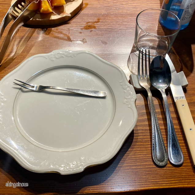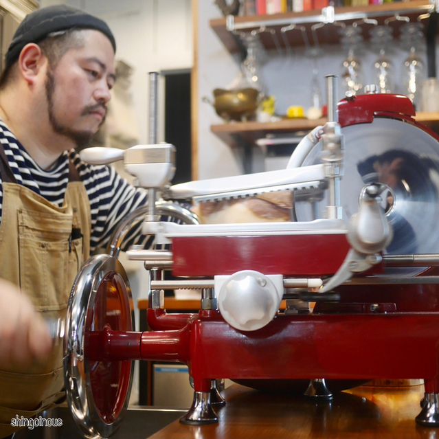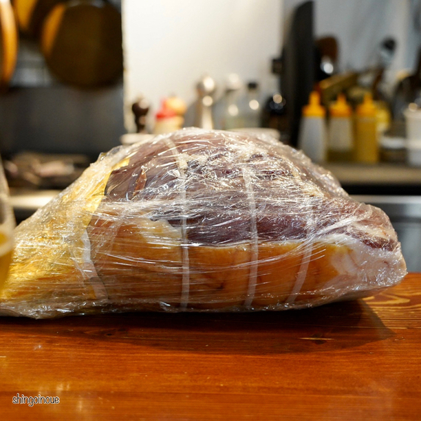 ということで生ハム。カウンターに置かれた大きな機械、実は手動で生ハムを切るマシーンだった。シェフいわく、自動で切る生ハムと手動できる生ハムはぜんぜん違うらしい。丁寧に生ハムをスライスしてもらい、小さく切った梨と一緒にサーブ。これがめちゃくちゃうまい!この生ハムだったら永遠にワインが飲めてしまうのでは?と思うぐらいの旨さ。