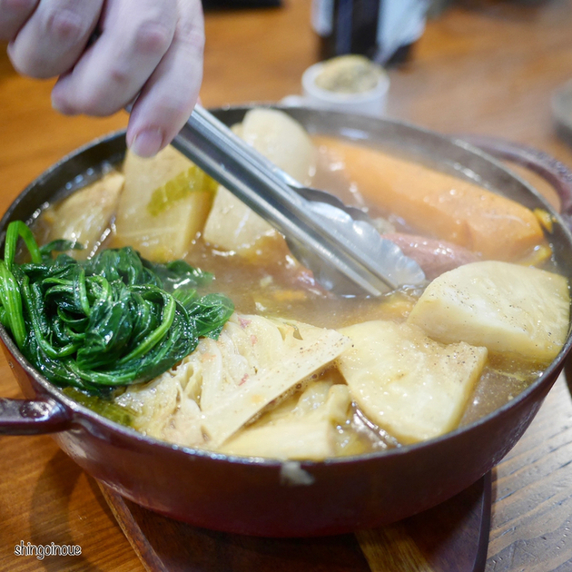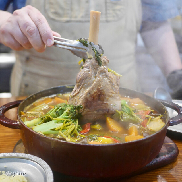 ということでメインのポトフ。シェフいわく「おでんみたいなものですよ」とのことだったが、「今日はこのタンを使います」と出してくれたのは、まさかの仔牛のタンまるまる一つ。ストウブの丸鍋を出してきて、その上に1匹分のタン。大きくきられた野菜(大根、白菜、人参、玉ねぎ、トマト、ほうれん草などなど)をざざっと入れて、火にかけていく。これ、2日分ぐらいの料理ですよ。15分ほど煮込んで目の前で蓋が開けてくれる。タンは柔らかくしっかり味が染み込んでいる。スープがあっさりしているがコクがあり、この季節に体を温めるにはぴったりだ。