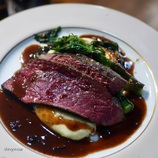 メインは「仔牛イチボのロティ(3,900円)」を。別のグループが「牛カイノミのステーキ」をオーダーしていたので肉が2つ並ぶことに。これが圧巻。また2つの肉を同時に調理していく工程が見れるというのもカウンタースタイルビストロの醍醐味。最後はきのこを使ったソースがたっぷり掛かって登場。美味いに決まってるじゃないか、という仔牛のイチボだった。