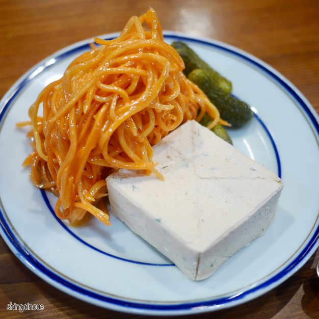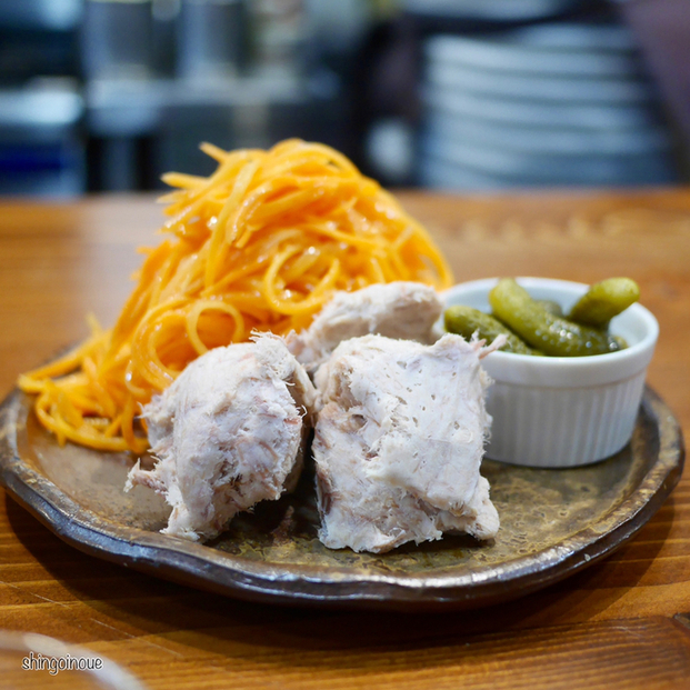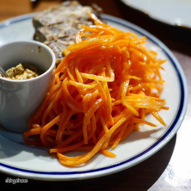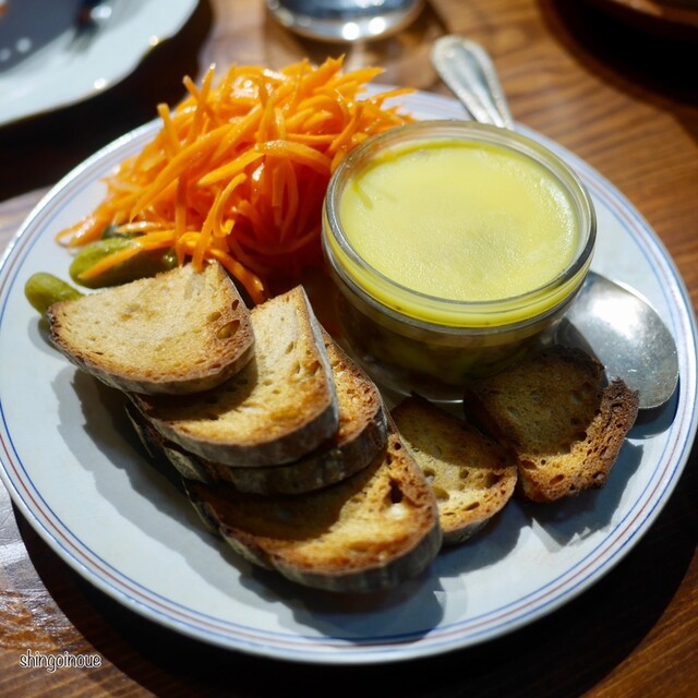 続いて豚のリエット。なんかこの日はリエットが食べたかったのだ。これにキャットラペとピクルス、マスタードが付いてくる。実はこの組み合わせが最高なのだ。付け合せのパンを程よい大きさにちぎって、リエットとラペ、マスタードを挟んで食べると最高の味わい。ちょっとキャロットラペの塩味が強いので、単体で食べるよりも組み合わせで食べるというスタイルが面白い。