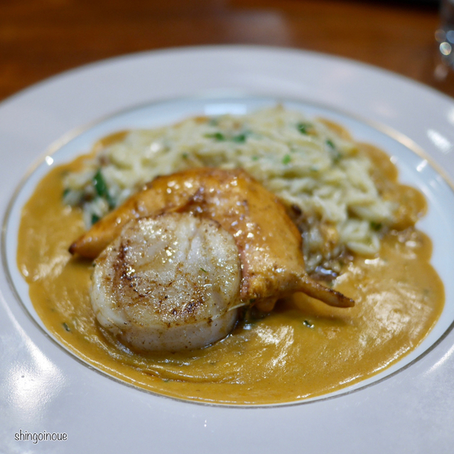 前菜はこれぐらいにして、メインの前の魚料理でホタテを。「天然殻付き大ホタテのポワレ」。ホタテの天然というのは季節も限定されるし、なかなか手に入らないらしい。そんなホタテを目の前で調理していってくれるわけだが、この工程を見れるのもアンファスのいいところ。どでかいホタテに火が入り、たっぷりのパスタ(リゾーニかな)とともに提供される。肉厚のホタテはもちろん、濃厚なソースの相性がめちゃくちゃ良くて、これだけ食べるためにアンファスに来るのもあり、と思わせる一品だ。
