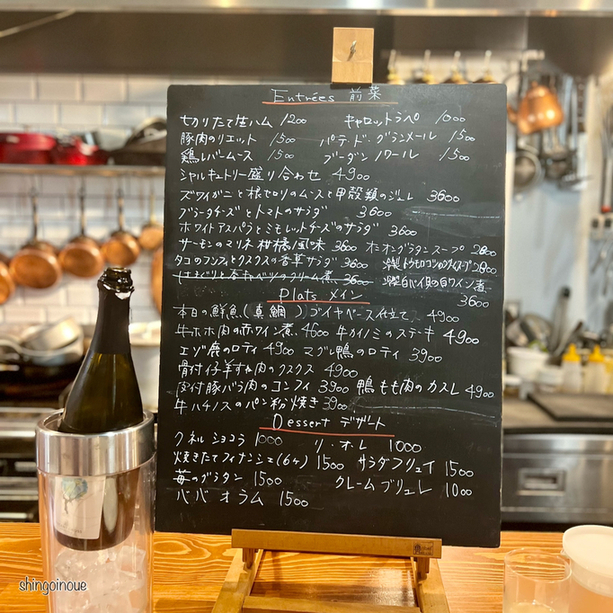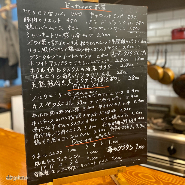 感染症対策を考え、各グループに一つずつアルコール除菌液を設置、また席の数も減らし、お客さん同士の距離を少し開けている。とはいえ、この日も3組のお客さんで店内は満席だった。メニューはいつもどおりシンプルで「前菜」「メイン」「デザート」が黒板に書かれている。