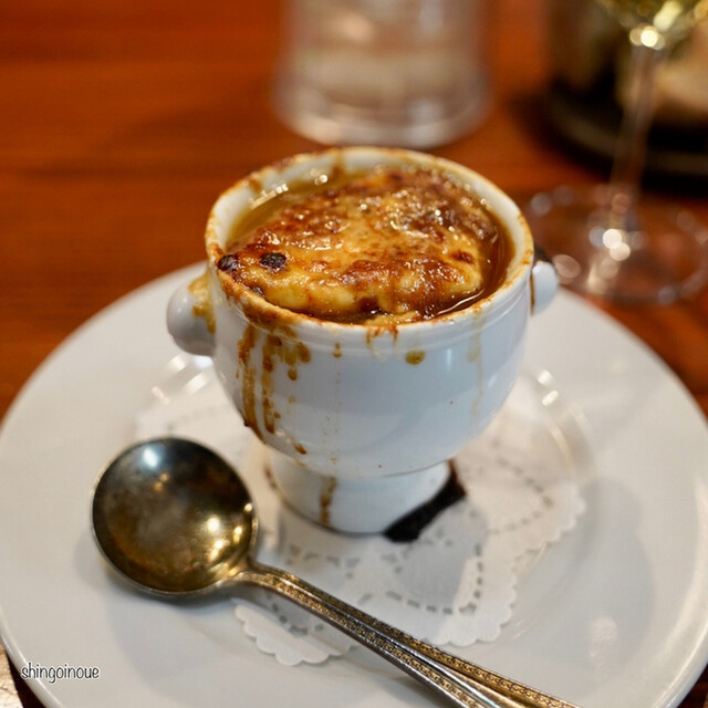 オニオングラタンスープの前に白ワインに。アルコリットル(レ・サボ・デレーヌ)はエチケットの赤っ鼻が特徴。このワイン、なんと1リットルなのだ。ゆっくり長く飲むのには最適なワイン。そしてオニオングラタンスープ。作らていく工程を目の前で見られるのはカウンタービストロの醍醐味だね。もう食べたくて仕方なくなってしまう。