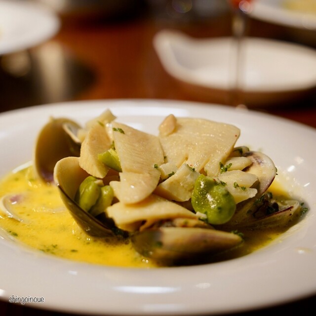 この日は、前菜から「ハマグリとキャベツのクリーム煮(2,800円)」を。たっぷりのハマグリをストウブ鍋に入れて、キャベツと牛乳と煮込む。本当にシンプルな料理だけど、だからこそ素材の味が生かされる。めちゃ美味いですよ、これ。