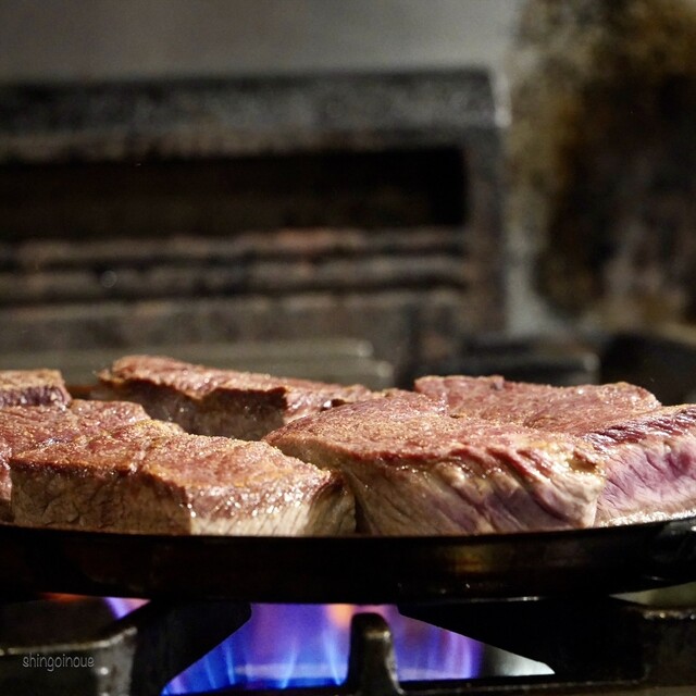 最後のメインは「牛カイノミのステーキ」を。こちらも目の前でどんどん出来上がっていくのが嬉しい。まぁ、控えめに言って火入れが最高。表面の香ばしさと中の肉の旨味が共存していて、食べ終わるのがもったいないタイプのカイノミだ。アンファスのメインはどれも美味しいけど、このカイノミはぜひ食べてほしい一品かな。