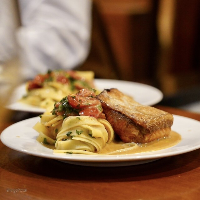 鱈白子のムニエル。丁寧だけどちょっと強い目に表面を火入れした白子はポーションがでかい!中がフワフワトロトロで食べごたえも十分。少しスモーキーなバターの香りが絶妙にマッチしている。