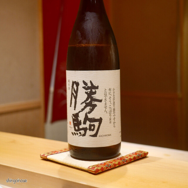 続いて、赤身。なにか(失念!)を挟んで、大トロ。光り物(失念!)。美味しすぎて次々食べていたら記憶が…… そんな記憶をどんどんなくさせる美味しい次の日本酒は富山の勝駒。こちらはふくよかな味がいい。