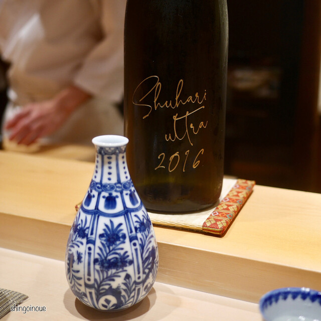 ということで、ここからが握り。最初は天草のコハダ。コハダって世界で一番キレイな握りだと思う(個人的に)。これが最初に出てくることで舌がリセットされるし、気が引き締められる。コハダの次はカスゴ。カスゴの昆布締めだ。日本酒もなくなってきて、出てきたのは「出雲富士」。島根県出雲で作られる超辛口の一品。
