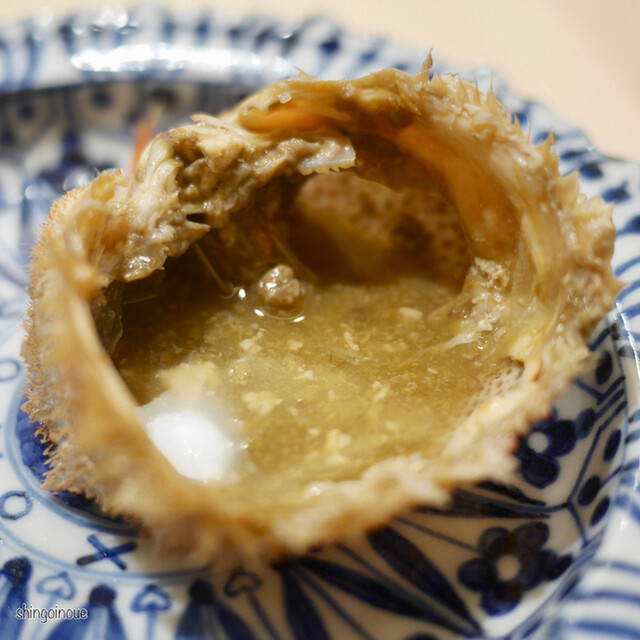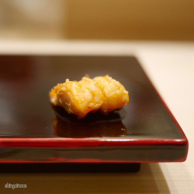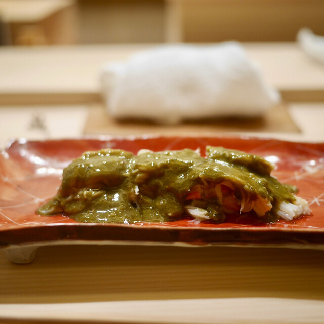 そうこうしているうちに、目の前にはボタンエビやメジマグロなどが。これは鮨に向けた仕込みだった。蟹の料理はまだ続く。香箱蟹の季節が終わり、この日はメスの毛蟹だった。メスの毛蟹は規制が激しくなかなか食べられないらしい。また少し時期的には早いということだったが、なかなかどうして。フワフワの身と濃い味が身体に染み渡る。少し残ってしまうな、、と思ったらここでも「付け合せの酢を入れて飲んで食べてしまってください」という優しいお言葉。しっかり完食しました。