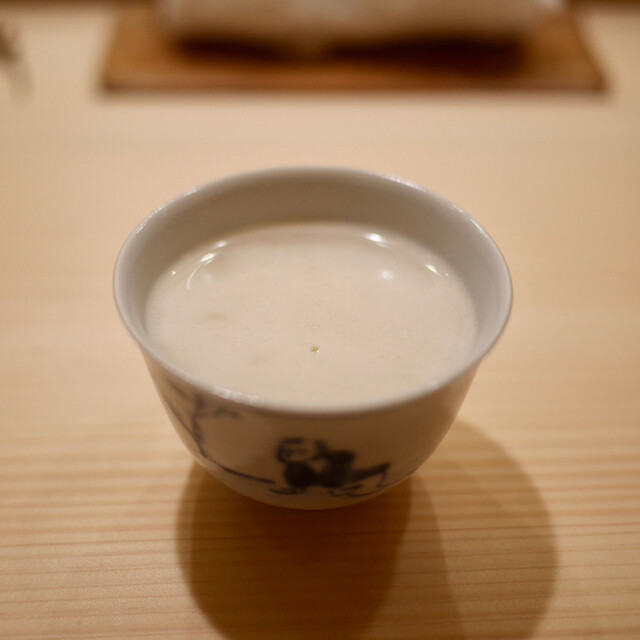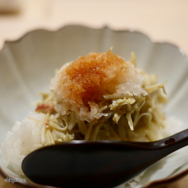 ということで、最初は富山産のベニズワイ。水分量が多いのが特徴で、一口でお願いしますという言葉とともに。一口で食べてわかるのが蟹の味のこさ。うまい蟹っていうのは蟹自体に美味しい味がある。そして、続いても紅ズワイガニ。蟹の足を立てて、ぐっと押し出していく。この立てるってのが大事で、後ほどのフワフワ感が生まれるのだろう。ちょっと蟹の茹で汁をかけていただく。こちらは3口で、とのことだったがやっぱりうまい。少し出汁がお皿に残ってしまってもったいないな、、と思ってたら、斜めにして飲んでもいいですよ、という優しいお言葉。