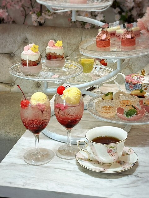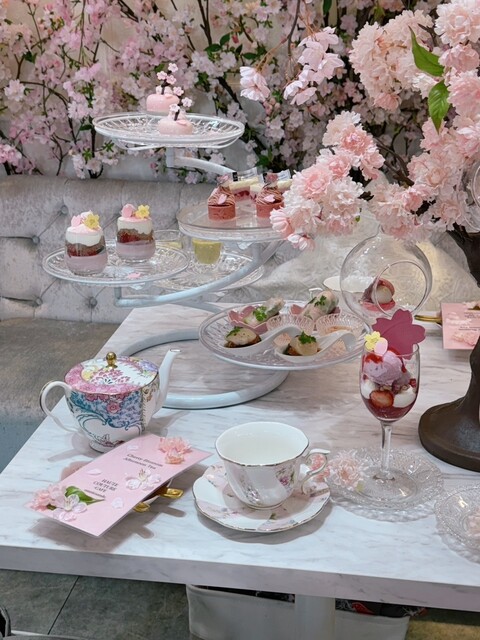 桜が咲き乱れる中、テーブルの上にも食べられる桜のスイーツやお料理が並び、ティールームで幸せ時間を満喫。