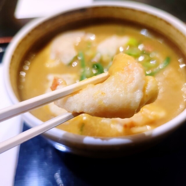 ぷりぷりの海老ですよ。美味しいです。このクリーミーなカレー汁ととてもよく合います。ちなみに竹やのカレー汁は、シャバシャバとしていてクリーミーです。スパイスもまあまあ効いてますが「辛い!」っていうほどではありません。野菜の旨みが溶け込んだスープ。