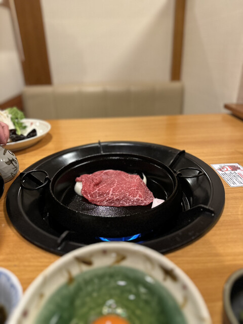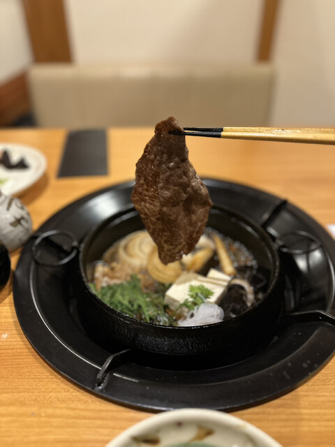 すき焼きは米沢牛の赤身とお野菜などに、ご飯・お味噌汁・お漬物などが付きます。店員のお兄さんにお願いして焼いて頂きました。牛脂を焼き、お野菜を敷き、その上に牛肉を乗せすき焼きのタレを注ぎます。両面焼き色が付いたら食べ頃と教わりました。