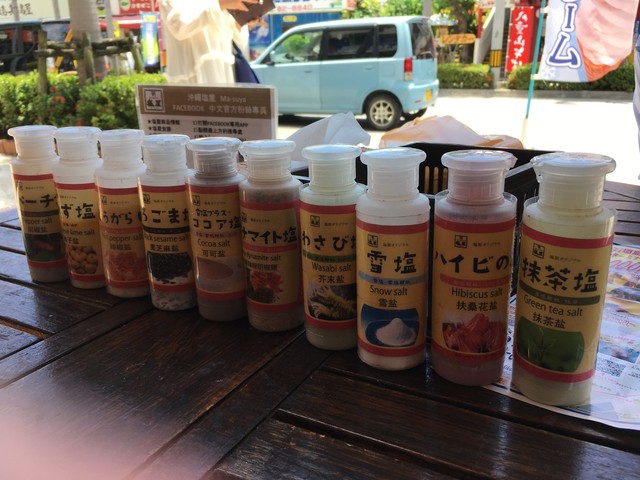 ここにある塩かけ放題です。抹茶塩、ハイビの塩、雪塩、わさび塩、ダイナマイト塩、ココア塩、ごま塩、他 全部かけた中でベスト2を選ぶなら、スパイシーなダイナマイト塩 とわさび塩です。 色んな味を試してかなり楽しめます。