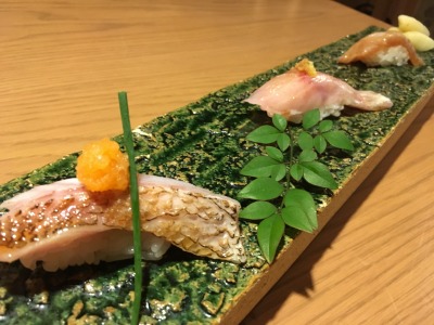 写真奥から、大根の甘酢漬け(梅肉乗せ)、天然ヒラマサの炙り(もろみ味噌乗せ)、ヤリイカ炙りです。うぁ~!!先付けから感動です!新鮮な獲れたれそのままの味がにぎりになってとても美味しい!