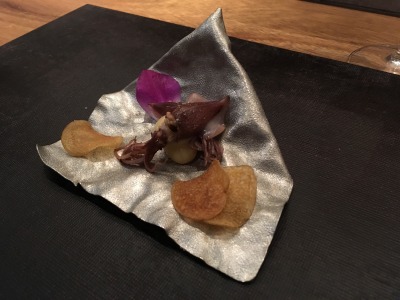 ①前菜は兵庫県ホタルイカボイル、ウド、新じゃがチップス(フランス産柑橘ビネガー使用酢味噌、ハーブティパウダー)