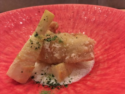 金目鯛の竜田揚げ(静岡産)筍の素揚げ(ヨーグルトソース、抹茶)