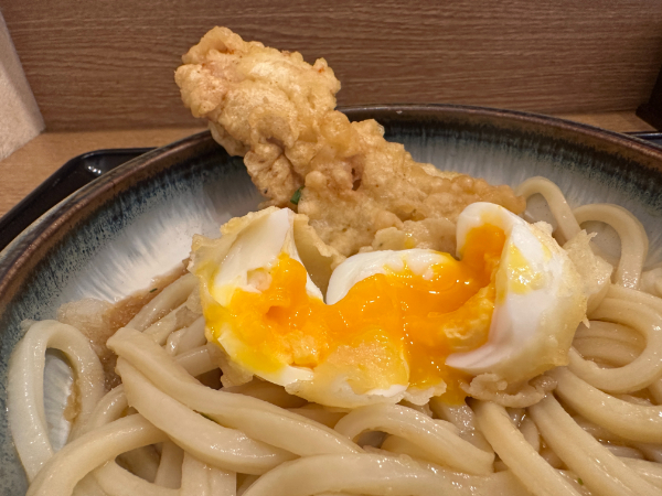 うどんの上で割ると、とろーり卵黄が美味しそうな顔して出てきます。