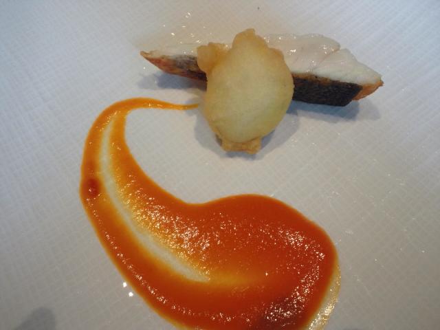続いてお魚は、パプリカのソースでいただくヒラスズキ …初めてです。それもそのはず、スズキと比べ、味も価格もヒラスズキに軍配が上がると書いてあります。