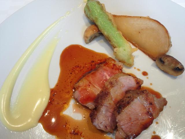 さて、こちらの付け合わせは、バナナピーマン、黄蕪、マッシュルームで、ソースはジャガイモ(インカの目覚め)とフランス産チーズでできているそうです。赤いソースはちょっぴりピリ辛でこれも抜群に美味しい☆