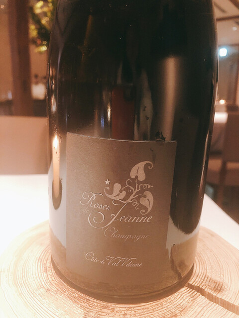 最初に家族経営の小さな造り手によるというシャンパーニュから。アミューズは温かいお料理で嬉しい!白子の揚げたのに赤玉ねぎ等の酸味と、ジャガイモのクレープの甘味を組み合わせています。食感も楽しいです。