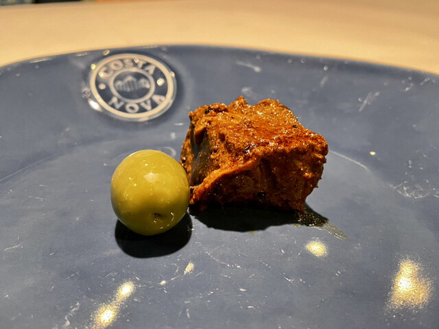クリスピーポークには、スイカのアチャット、黒ニンニク、菜花とランペのピューレ。とボスならではの組み合わせがまた良い。
