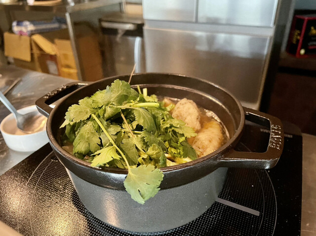 根付きのパクチーと比内地鶏の出汁がたまらんよね〜。ビリたんぽ崩すと、スパイス感増してくるやつ。