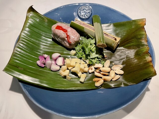 小さな沢蟹を乗せたソムタムやら、自家製ネームで作る茶碗蒸しやら、自分で巻いて楽しむグリーンカレー生春巻きやら、KALAワールド全開ね。