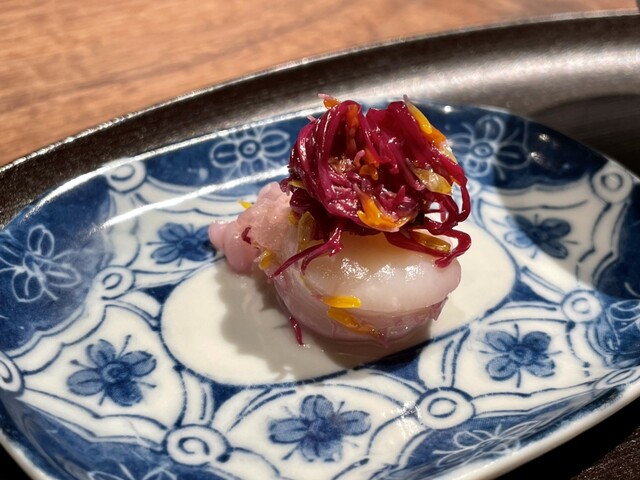 ②季節の前菜2品 いたや貝甘酢和え、たらの白子四川ソース