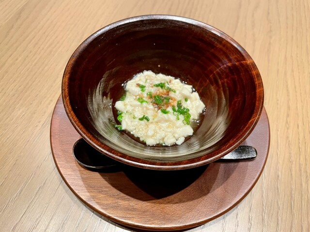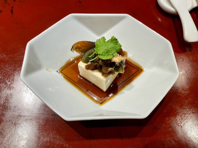 八碟 布豆腐 干しエビ、豚ミンチ、四方竹、合鴨砂肝 揚げ 煮凍り