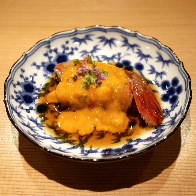 『ボタン海老炙り、ウニソース』