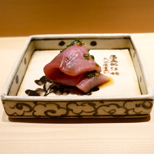 先ずツマミでは『メジマグロ』、これは脂ののりも漬け具合も丁度良く、噛む程に美味しさが感じられました。また、出始めですが、プリプリな子持ちヤリイカもタレとの相性も良く絶品でした。